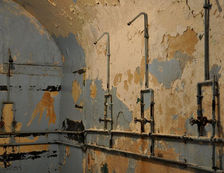 The floor was treated with a cracked bathroom tile pattern, designed to appear severely aged with a yellowish tint and stained grout to evoke the atmosphere of a deteriorating asylum bathhouse. Initially, the tile scale was set at 24” squares, but after testing a sample in the space, the size was reduced to 10” to more accurately reflect standard bathroom tile proportions. The surrounding walls were painted in a palette that matched the original architecture of the theater, reinforcing the illusion that the audience had entered into the asylum that was converted into a theatrical setting. The wall treatment included cracked surfaces and sections of peeling paint, suggesting the age and neglect of a poorly maintained facility.